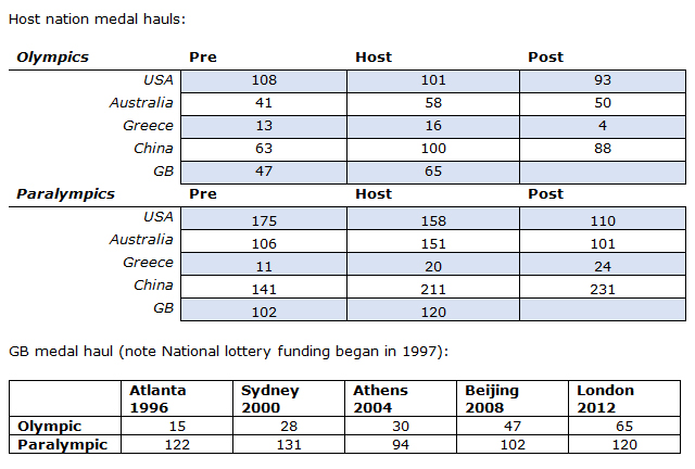 - Paralympic medal haul increased post-hosting for Greece and China, but dropped by 33% for Australia